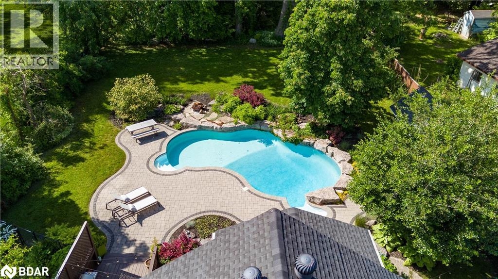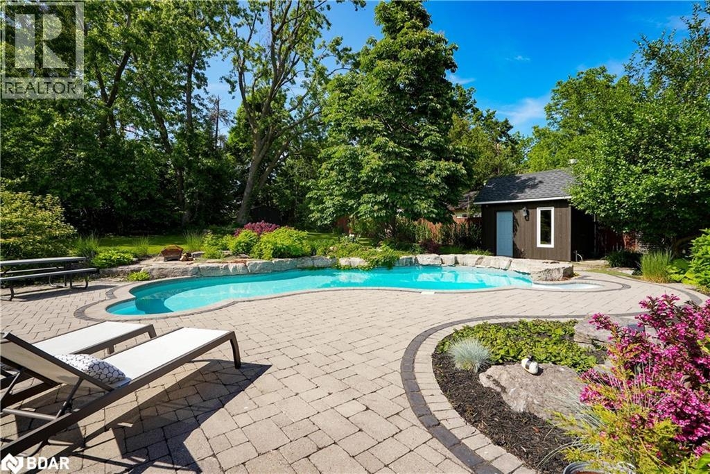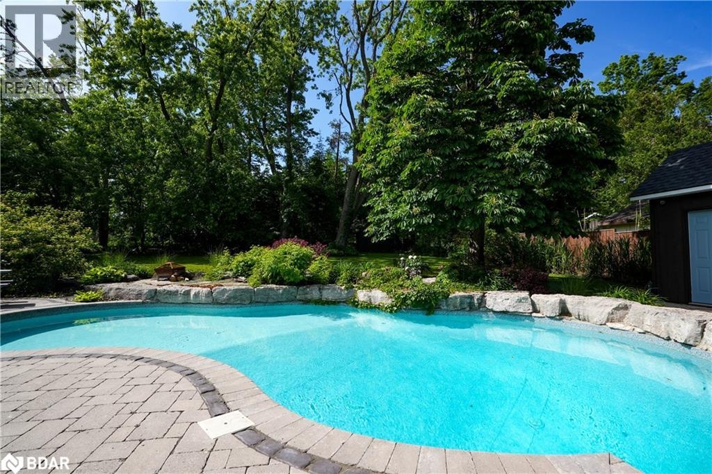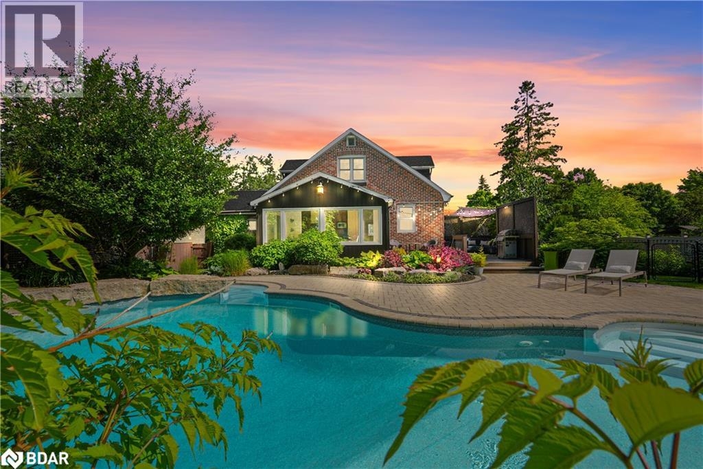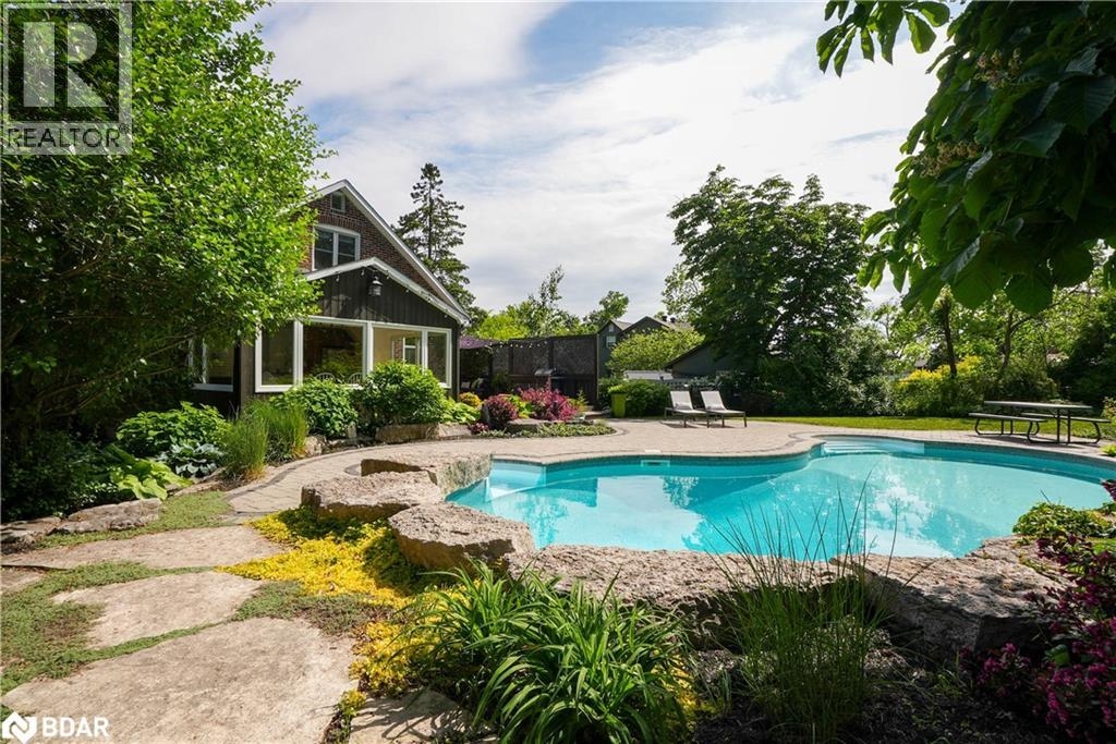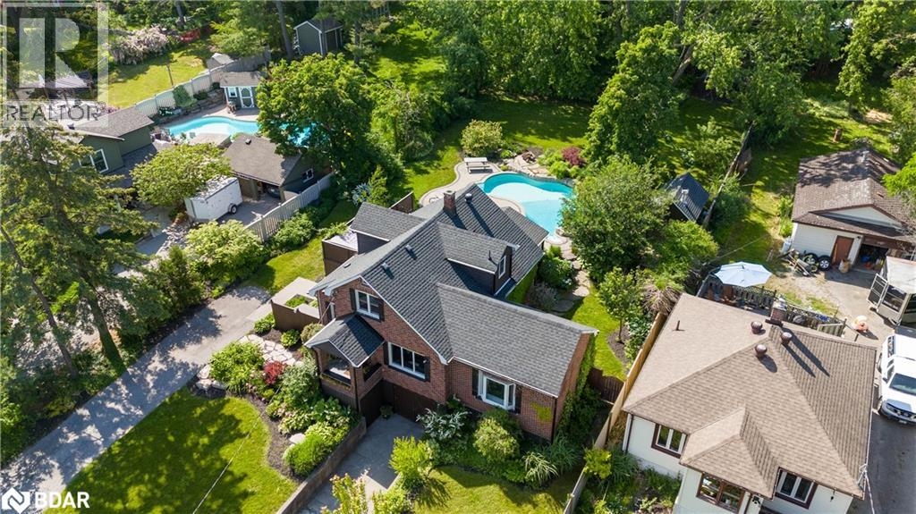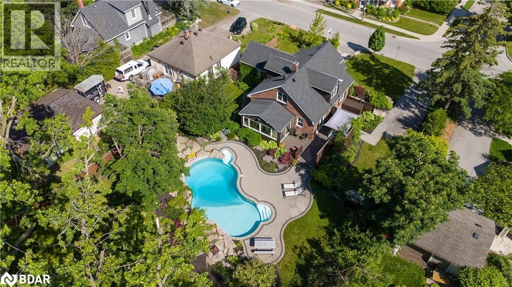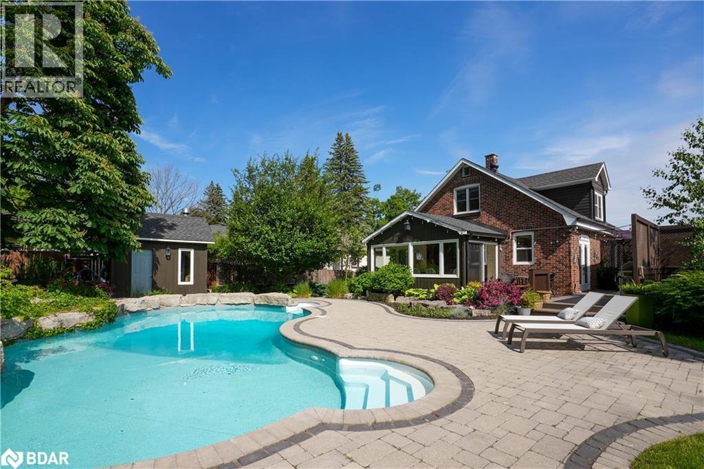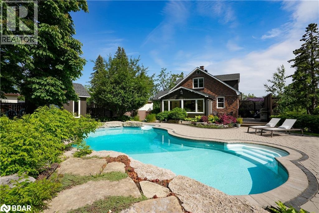 Set on one of Barrie’s most prestigious streets, this exceptional 3-bedroom, 2-bath home combines timeless character with modern comfort— offering a rare opportunity to own nearly half an acre in the heart of the city. Framed by towering trees and located just minutes from the lake, top-rated schools, and vibrant downtown amenities, this all-brick residence is a true standout. Inside, you’ll find engineered light oak flooring, pot lights throughout, and a neutral, move-in-ready palette that highlights the home’s historic charm. The spacious kitchen features solid oak cabinetry, quartz countertops, a bar sink, tile backsplash, and expansive windows that overlook the showstopping backyard. Upstairs, two bright bedrooms include one with custom closets and built-ins, while the third bedroom and beautifully updated bathrooms (3-piece on the main, 4- piece upstairs) offer flexibility for family living or guest space. A finished basement provides a dedicated laundry area, additional storage and a recreation space perfect for entertaining/childrens playroom. What truly sets this home apart is its luxurious, professionally landscaped lot— measuring 87 feet wide by 236 feet deep. Step outside into your own private resort: interlock and flagstone pathways wind through lush gardens, with armour stone features adding dramatic elegance. At the heart of this private oasis lies a stunning kidney-shaped in-ground pool, artfully set into its natural stone surroundings and complemented by a charming pool house—all fully fenced and surrounded by mature greenery that ensures year-round privacy and serenity. Additional features include two driveways, a fully fenced yard, and unbeatable access to parks, waterfront trails, cafes, and shops—all within walking distance. (id:2469)